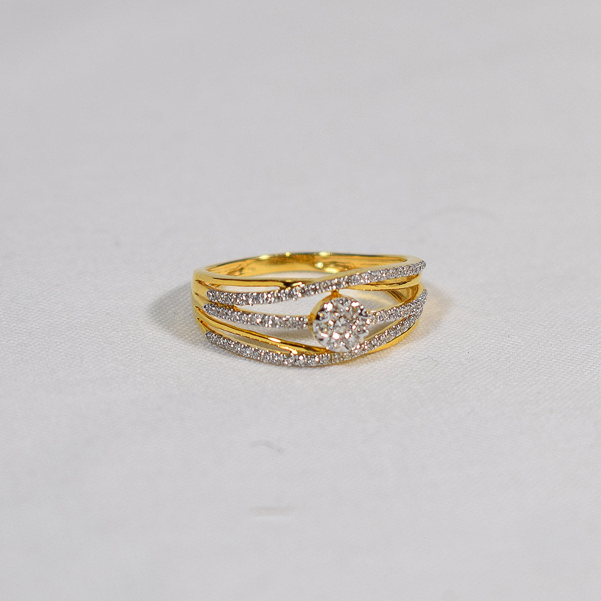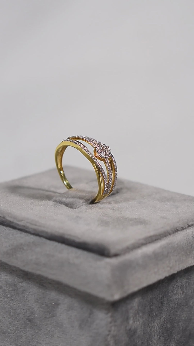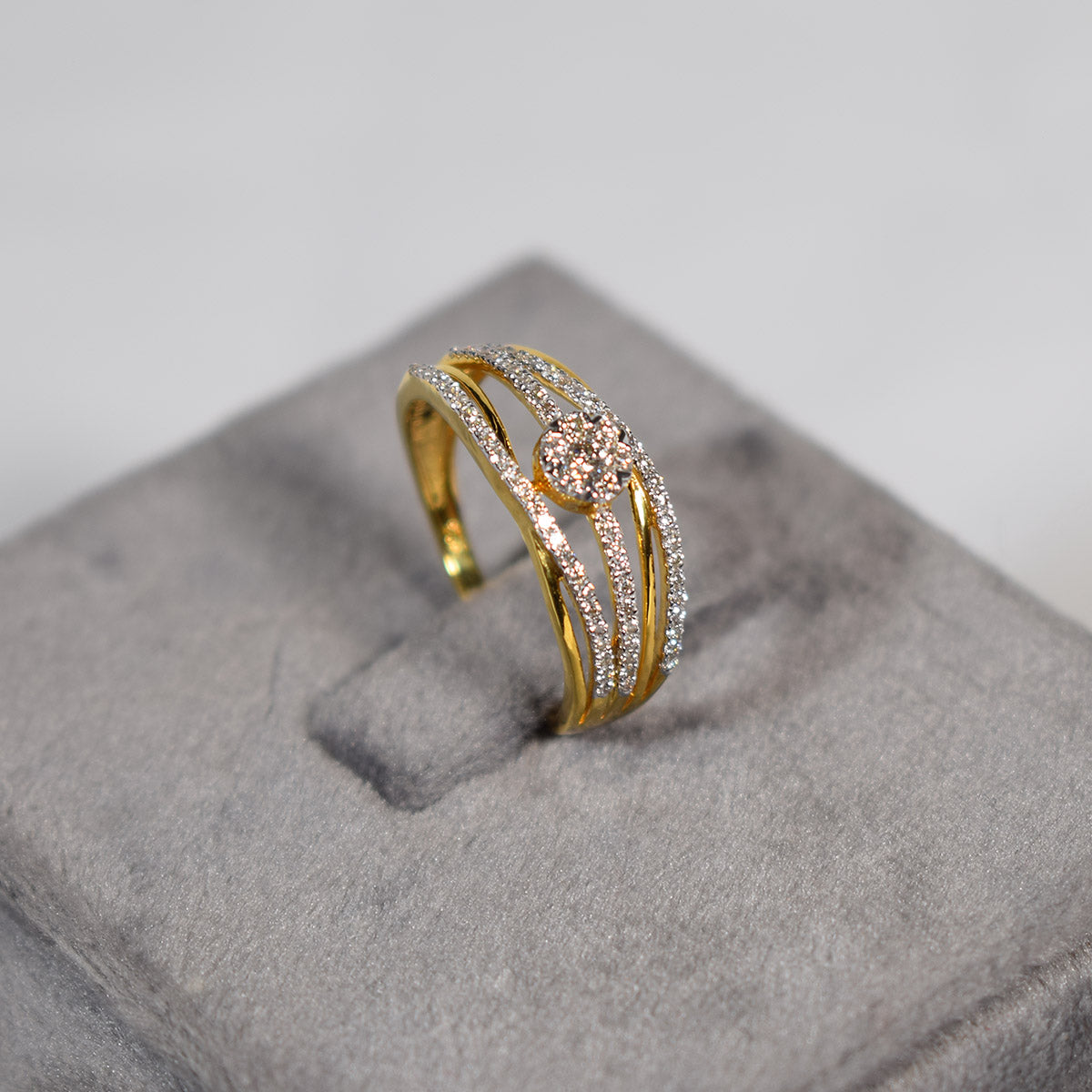 Multi band structure in yellow gold with radiant crystal cluster ring